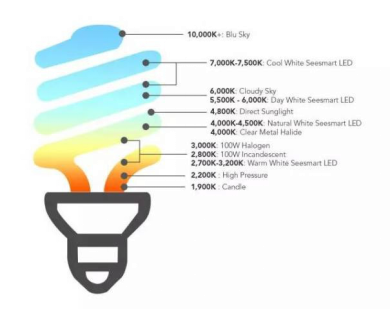 色溫是表征光譜能量分布的指標(biāo),色溫高,光譜能量分布于短波的成分略多,顏色偏藍(lán)。色溫低,光譜能量分布于長(zhǎng)波的成分略多,顏色偏黃。單位是開(kāi)爾文(K)(蠟燭的色溫基本上是1800K)。