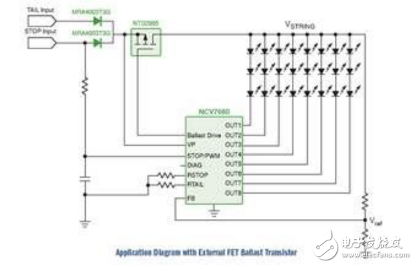 其三,LED組合尾燈控制器。NCV7680可以作為一個獨(dú)立器件,也可以作為配合復(fù)雜系統(tǒng)的額外支持電路。結(jié)合升壓控制器運(yùn)行時,額外LED可連接為一個LED串。其典型應(yīng)用包括組合尾燈、日間行車燈(DRL)、霧燈、中央高位剎車燈(CHMSL)陣列、轉(zhuǎn)向指示燈和其他外部調(diào)制應(yīng)用、液晶顯示器(LCD)背光等。